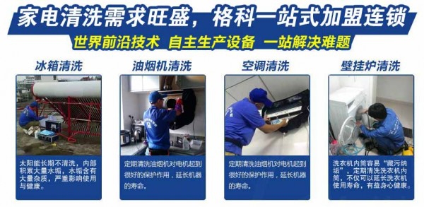 家电清洗还是一个新行业,市场还处于空白状态,谁先迈出第一步,谁就是第一个抓住了市场。格科家电清洗剂厂家产品齐全,覆盖20余种家用电器,是目前全国唯一一家绿色环保家电清洗产品厂家。格科家电清洗招商代理,一个区域只招一个加盟商,加盟商可招下级代理,独占市场,竞争少!操作模式多样产品既可以销售批发也可以上门清洗服务,摆脱传统清洗行业需要笨重设备及操作模式单一等制约!